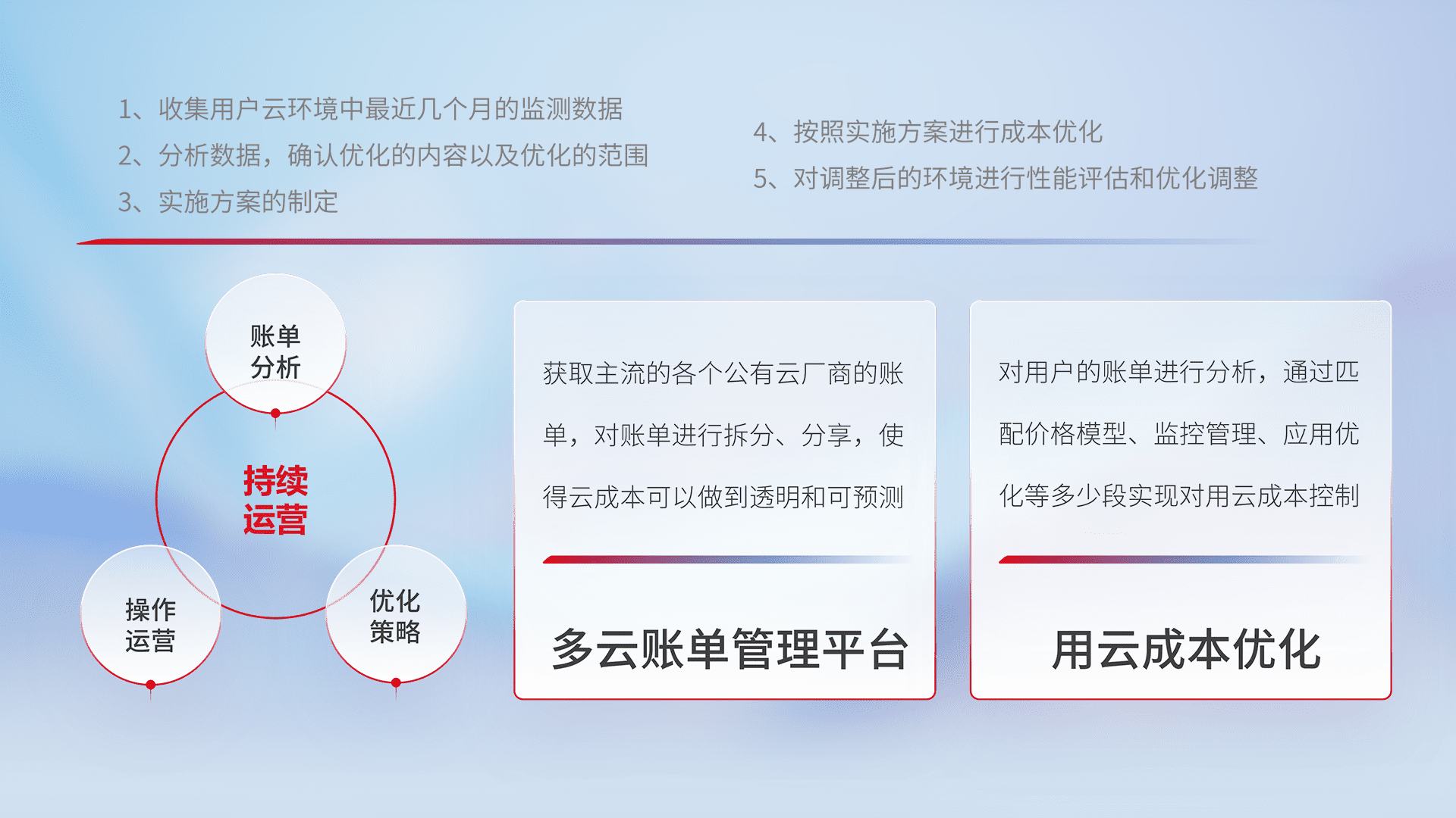 通过多云纳管,,以统一的资源数据模型把客户的云资源进行抽象和封装,,进而实现对多云资源的统一操作,,保障云资源管理的可靠性、、、稳定性与可用性。。。。量身定制化运维内容,,配置、、、开发运维、、、、补丁管理、、、备份、、、、监控、、认证和访问管理、、、、审计和日常巡检等,,,,保障在用云过程中的可靠度,,稳定度以及高可用率。。